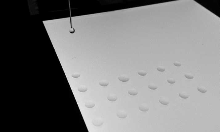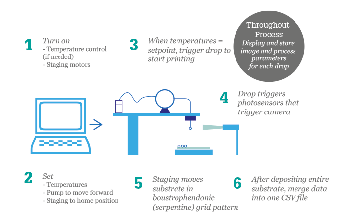 The formulated printing material starts in a reservoir and is pumped out of a Teflon or stainless steel nozzle positioned over the substrate. The size of the drop formed can be broadly selected with the nozzle size, and fine-tuned with settings on the positive displacement pump. The drop is deposited onto the substrate mounted on the XY staging, which moves the substrate under the nozzle, so the drops can be deposited in a grid pattern, as seen in Figure 2.