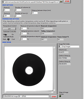 Feedback control, in which a correction to the process is applied based on a deviation of the current measurement from the desired setpoint, is not necessarily applicable to drop dynamics; given the rapidity of drop formation, measured deviations cannot correct the current drop but can be used to correct the following drops. For example, if a drop is found to be smaller than desired (and thus depositing less API than expected) there can only be changes made to subsequent drops to make up for this error. Therefore, the implementation of monitoring strategies on drop-on-demand systems is a necessity to ensure product quality. The DAMPP system contains a camera with accompanying photosensors and a backlight, which is triggered when a drop ejects from the nozzle. Each image throughout the process is displayed in real time, as shown in a screenshot of the user interface in Figure 5. The image is analyzed to calculate the volume of the drop, so if you know the concentration of API in the printing material, you also know the amount of API in that drop and the cumulative amount of API deposited on the substrate. This calculation, along with the drop location, drop images, temperature readings of various points of the process, and other data, is saved automatically and archived for easy reference.Exceptional Events Management