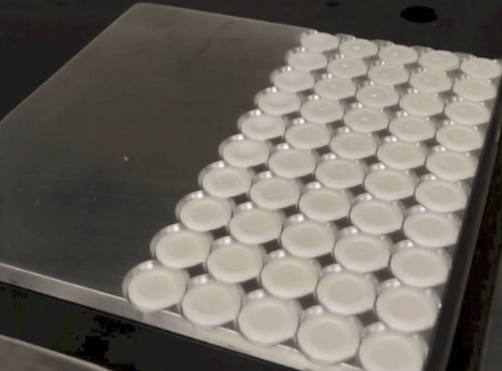 The DAMPP prototype has thus far been used to demonstrate production of two types of dosage forms: solvent-based and melt-based. Solvent-based formulations consist of a solvent, API and sometimes a polymer. Melt-based formulations consist of a polymer and API that are liquefied at the mixture’s melting point. The use of polymers in the formulation not only improves printability of the fluid and adhesion of the drops to the substrate, but allows for control over the final product morphology. Therefore, DAMPP can be used to produce stable amorphous or specific crystalline forms. The formulation type and polymers used can be selected based on the API’s crystallization behavior and the desired morphology. The DAMPP prototype has proven to be effective in printing solvent-based formulations, pictured in Figure 2, consisting of naproxen (chosen for demonstration for its rapid crystallization properties), polyvinylpyrrolidone (PVP), and ethanol (2). We printed drops using both a 30:70 and a 70:30 Naproxen:PVP formulation, with 1 gram of solid dissolved in 10mL of the ethanol solvent. Using varying drop sizes, we were able to produce completely amorphous forms (with the 30:70 formulation) or semi-crystalline forms (with the 70:30 formulation) varying from 33 percent to 77 percent crystalline. For melt-based formulation, we can use a low-melting-point polymer (or a lipid or surfactant) such as polyethylene glycol (PEG 3350) or Pluronic F38, in which the drug dissolves once the polymer becomes molten (3). We printed molten drops containing 15 percent naproxen and 85 percent polymer on inert tablets, as shown in Figure 6. Depending on the polymer used, we observed differences in drug dissolution behavior, and thus differences in the bioavailability of the drug. Although naproxen is crystalline in the presence of PEG and Pluronic, different deposit morphologies can be achieved by controlling the drop solidification process (5).