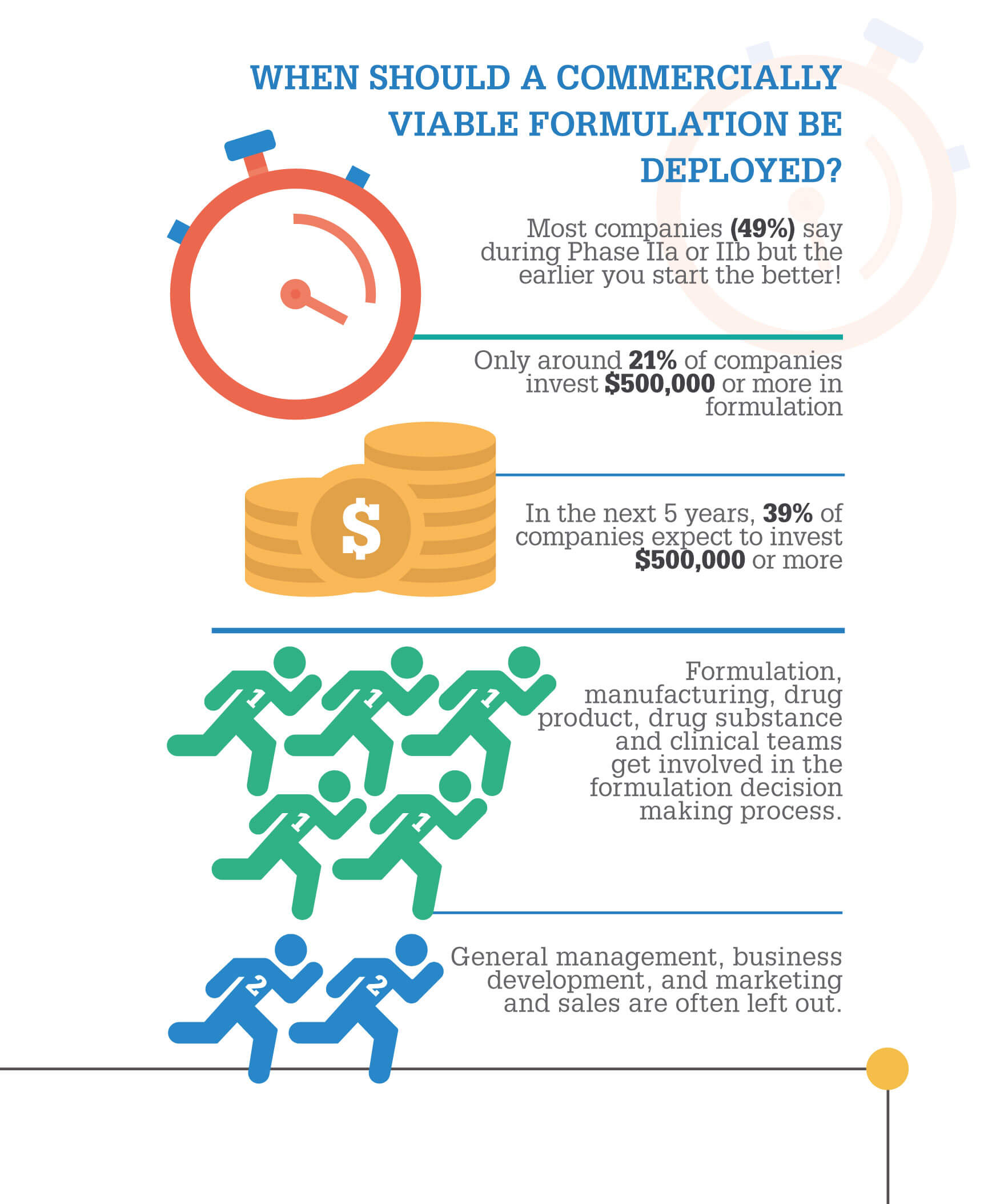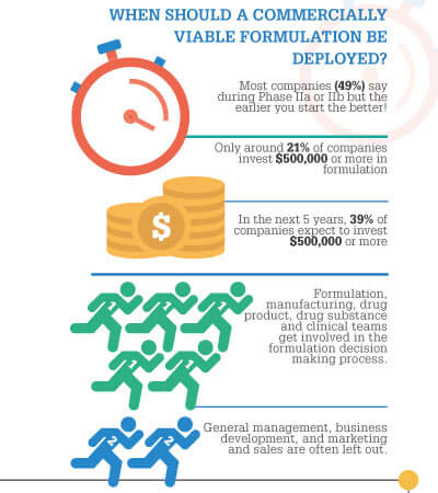 One of the most surprising findings for me was the fact that 60 percent of the respondents have experienced formulation issues during clinical development, some of which led to significant delays or even complete project failure. This makes formulation a key success factor in the process of drug development. Surprisingly, however, at the same time almost 60 percent of respondents believe that deploying a fully developed formulation should only take place at later stages of clinical development (around phase IIa or IIb). These two answers shed light on two important aspects and confirm our hypothesis when initially setting-up the Strategic Alliance: drug product formulation is a key aspect and value driver in the drug development process, but the importance of considering formulation at early stages is still underestimated by the industry.